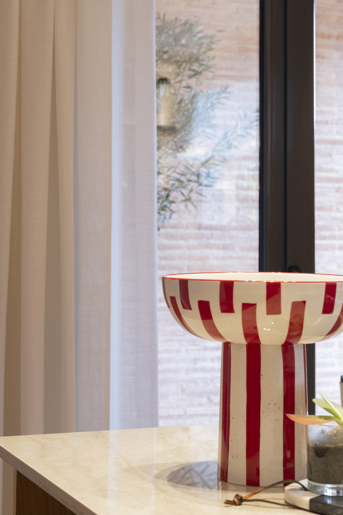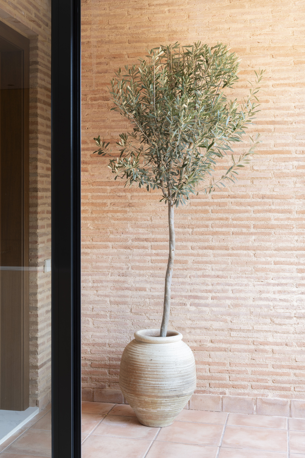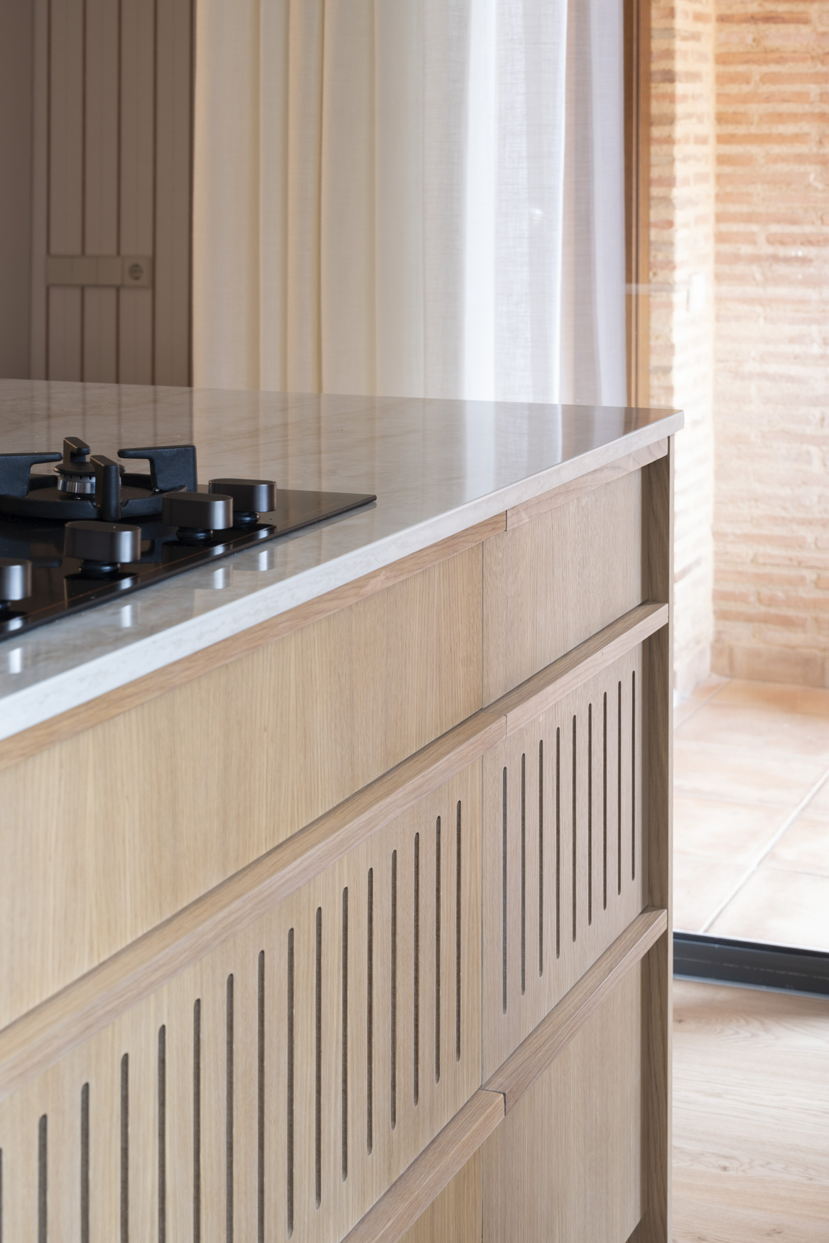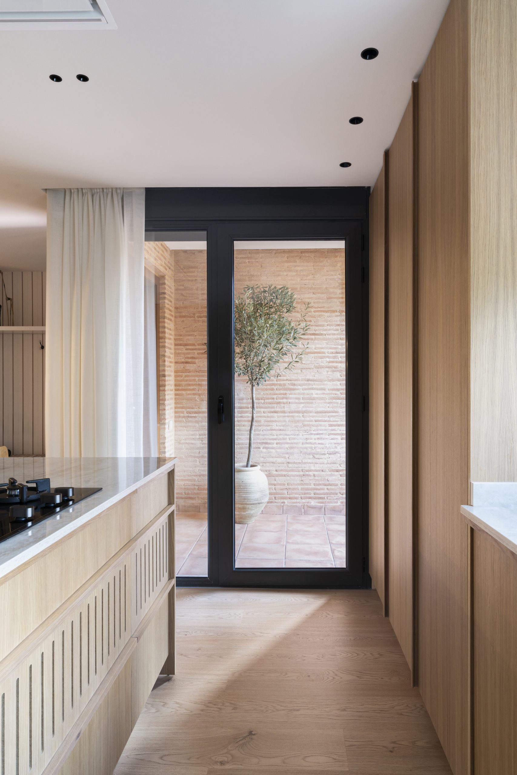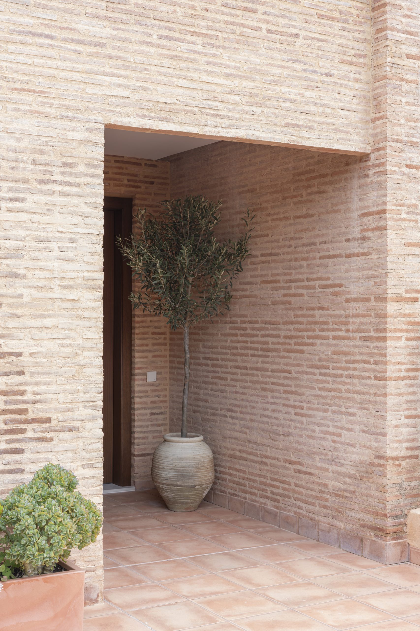 La arquitectura se apoya en una paleta honesta y cercana: ladrillo de barro, madera natural, piedra y textiles suaves que envuelven los espacios y aportan profundidad. El ladrillo visto aparece como un hilo conductor del proyecto, conectando interior y exterior y aportando carácter y calidez a la vivienda.