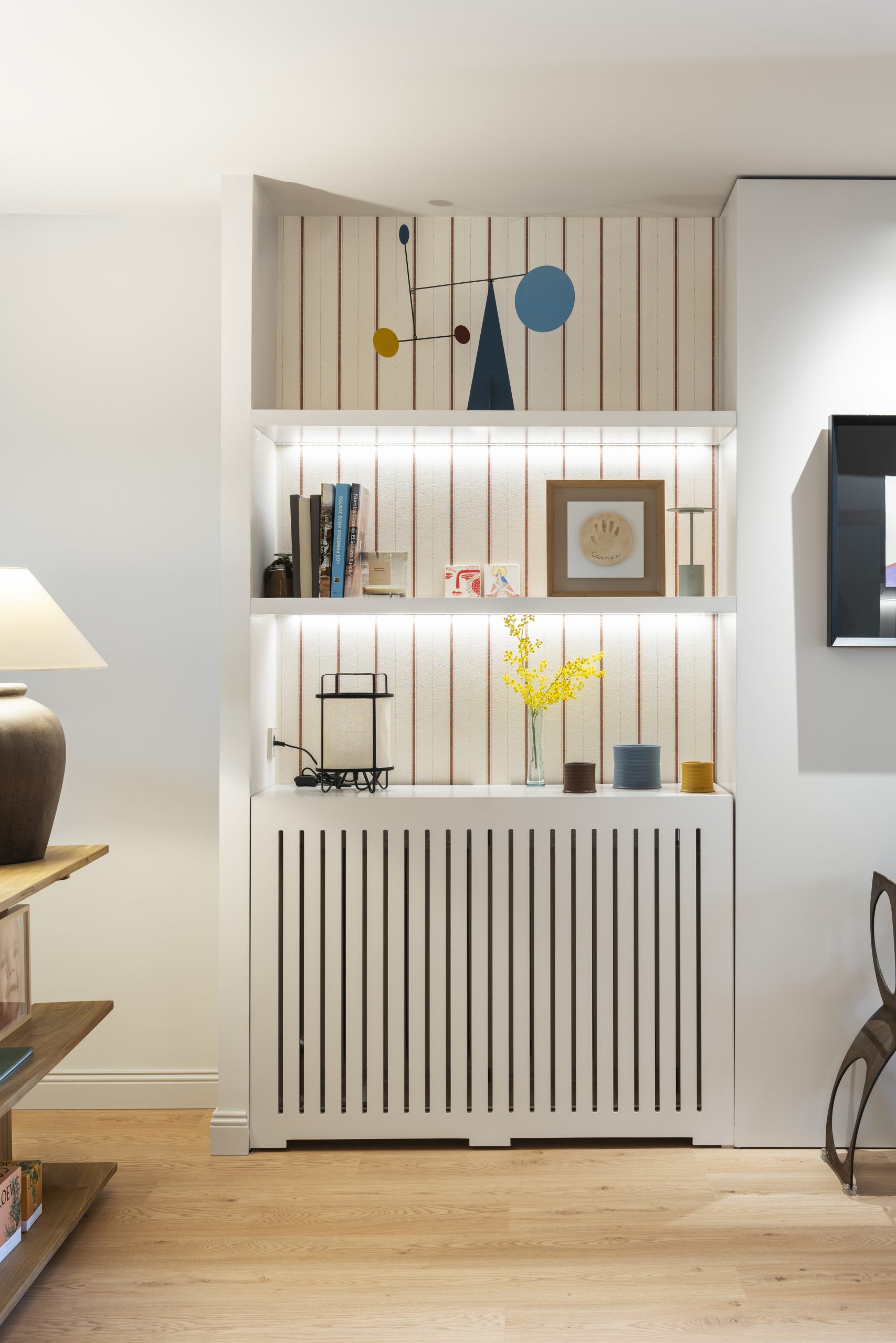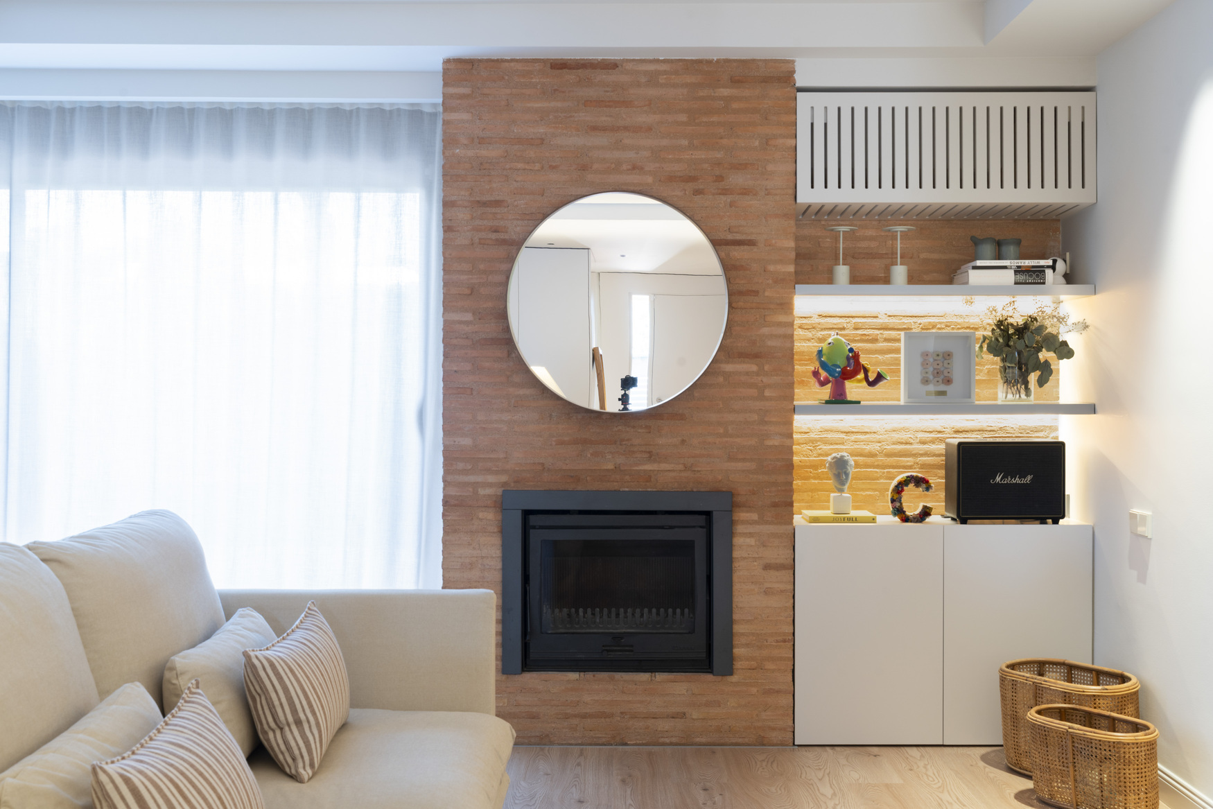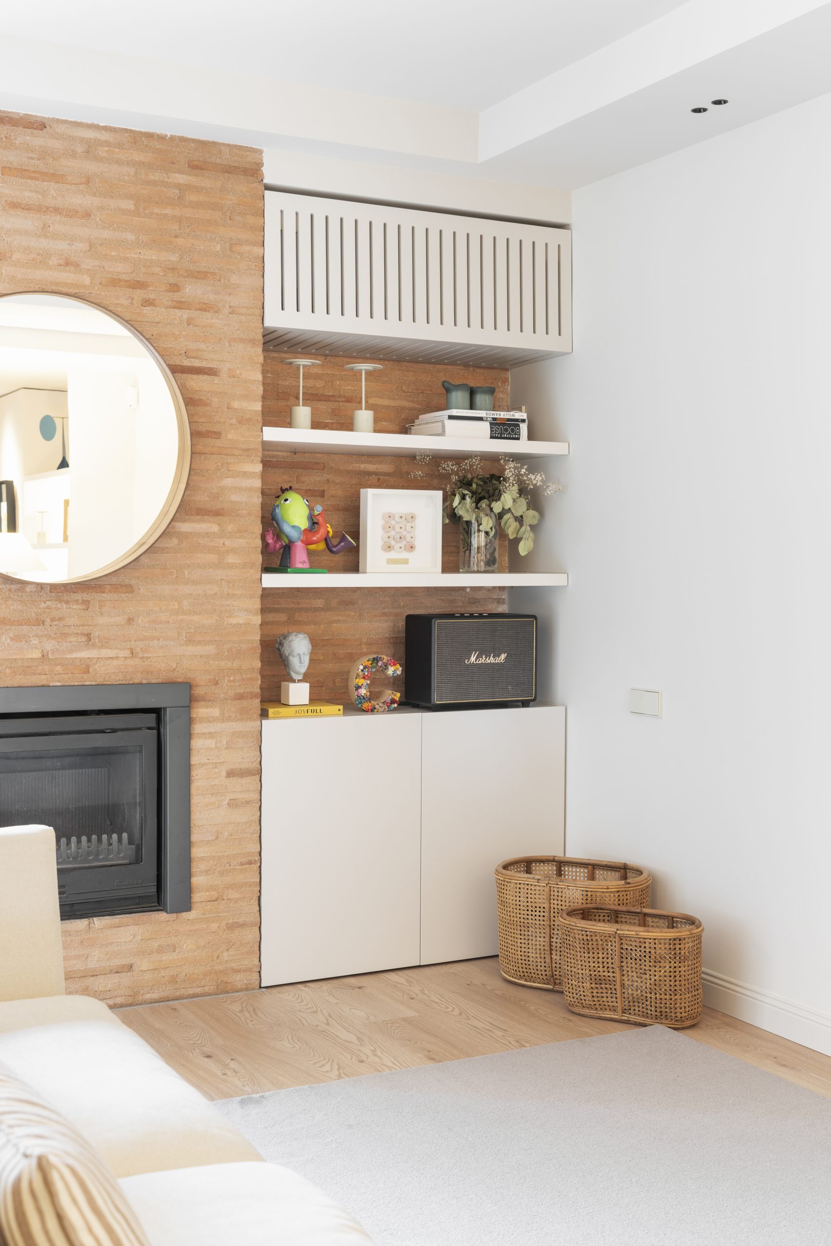 En el salón, el ladrillo adquiere protagonismo alrededor de la chimenea, creando un punto focal cálido y doméstico. Las piezas de mobiliario a medida y las estanterías abiertas aportan ligereza y permiten introducir objetos personales que dan vida al espacio.