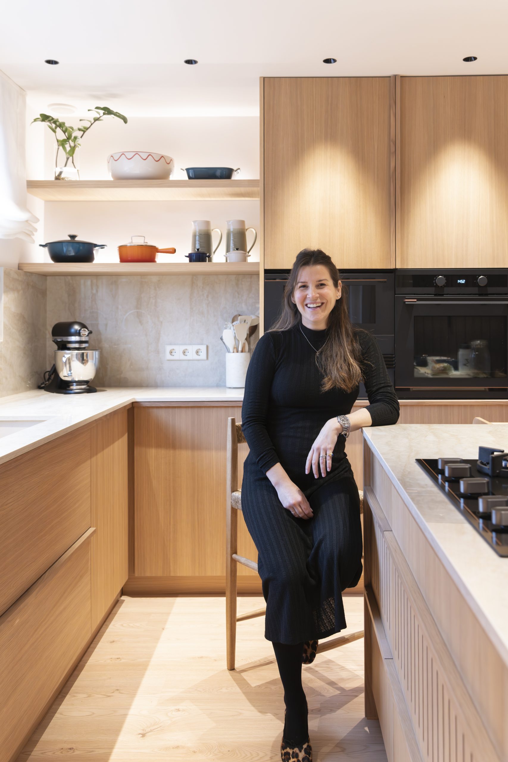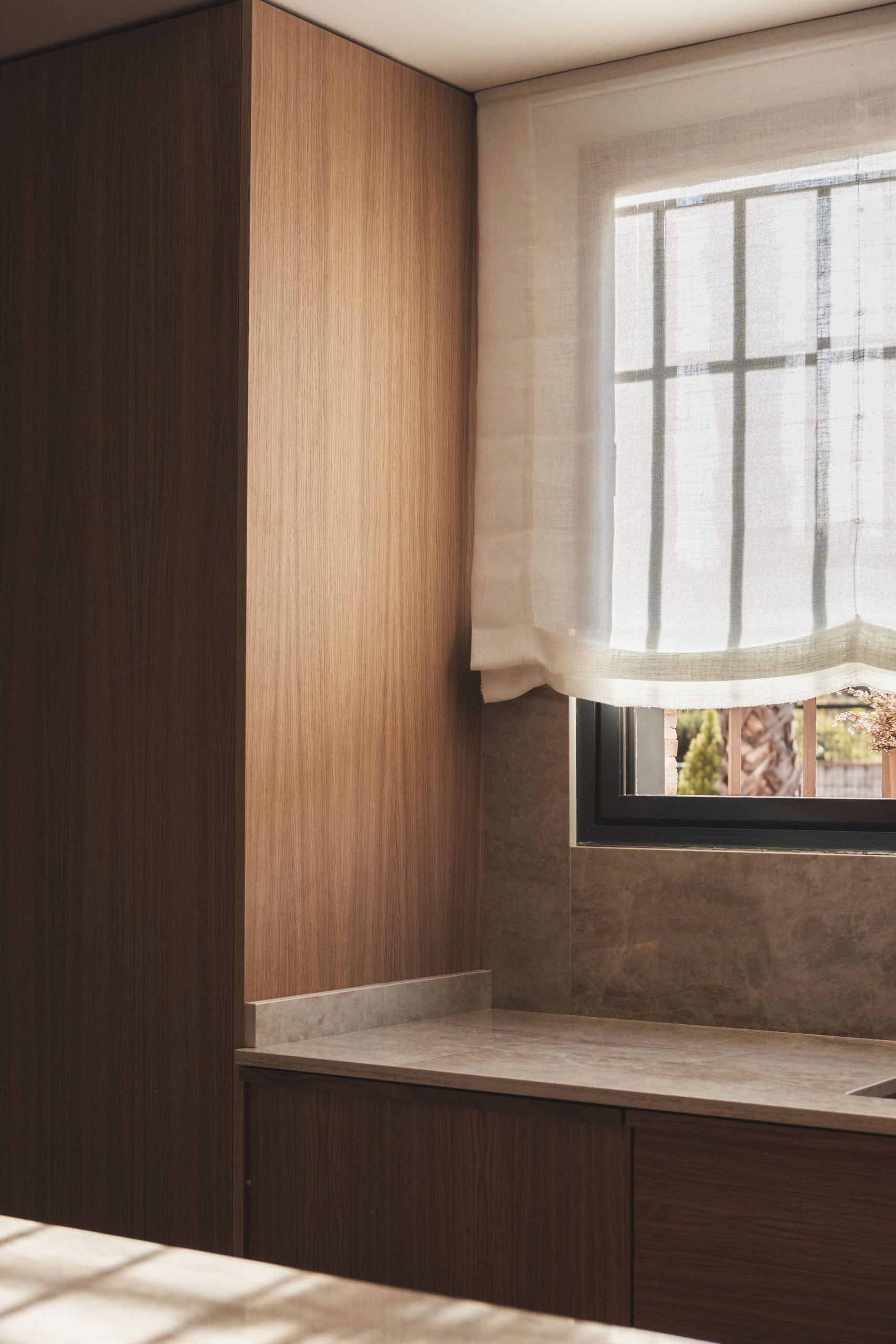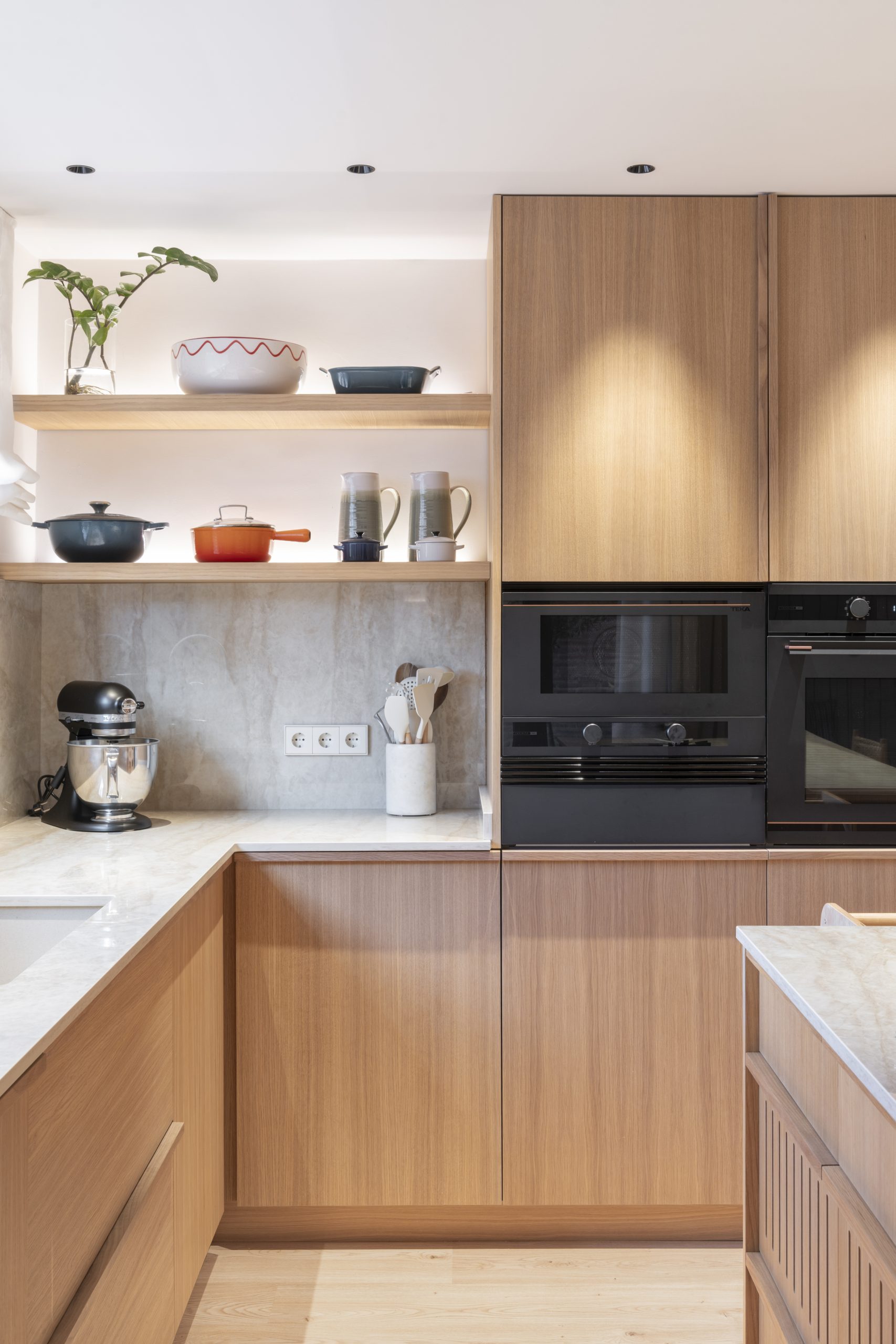 La cocina se plantea como un espacio luminoso y funcional, donde la madera en tonos naturales dialoga con encimeras pétreas y detalles cuidados. Los muebles se diseñan con líneas limpias y soluciones integradas, generando un ambiente contemporáneo que mantiene una fuerte conexión con los materiales tradicionales.