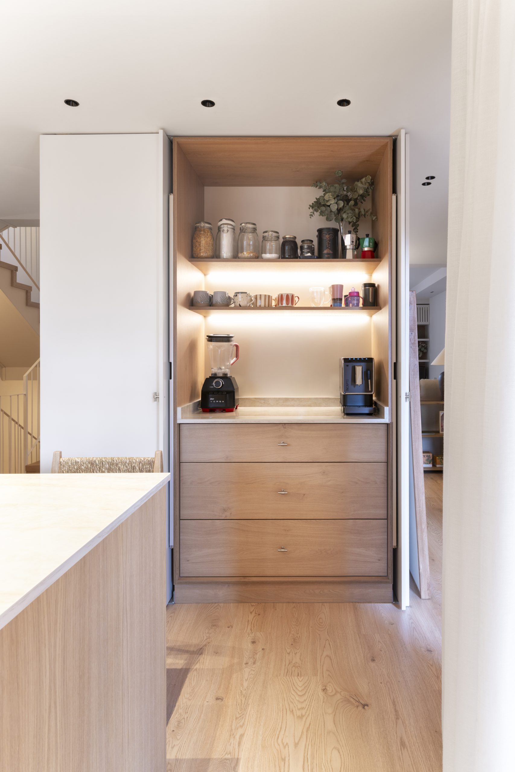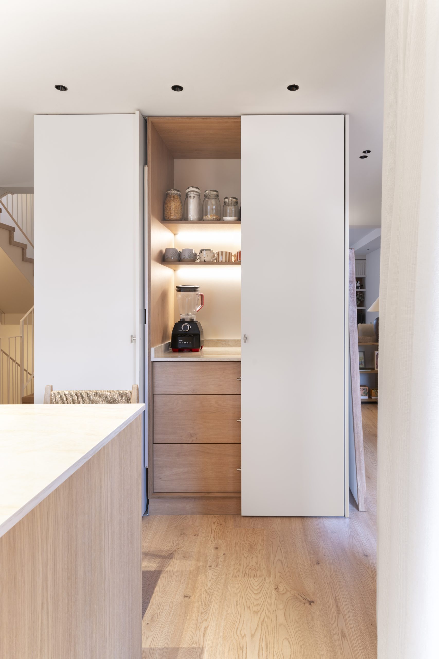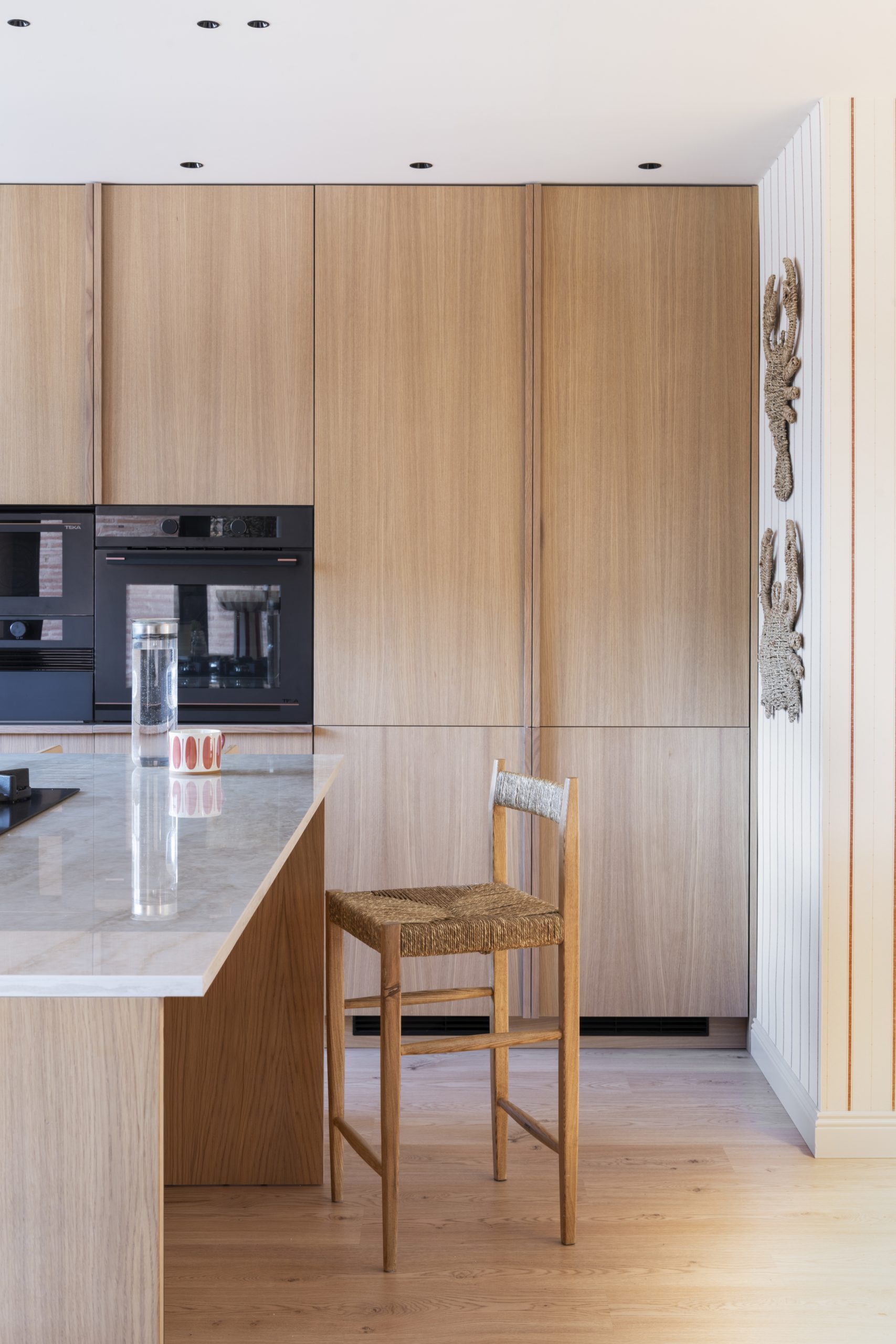 La cocina se plantea como un espacio luminoso y funcional, donde la madera en tonos naturales dialoga con encimeras pétreas y detalles cuidados. Los muebles se diseñan con líneas limpias y soluciones integradas, generando un ambiente contemporáneo que mantiene una fuerte conexión con los materiales tradicionales.